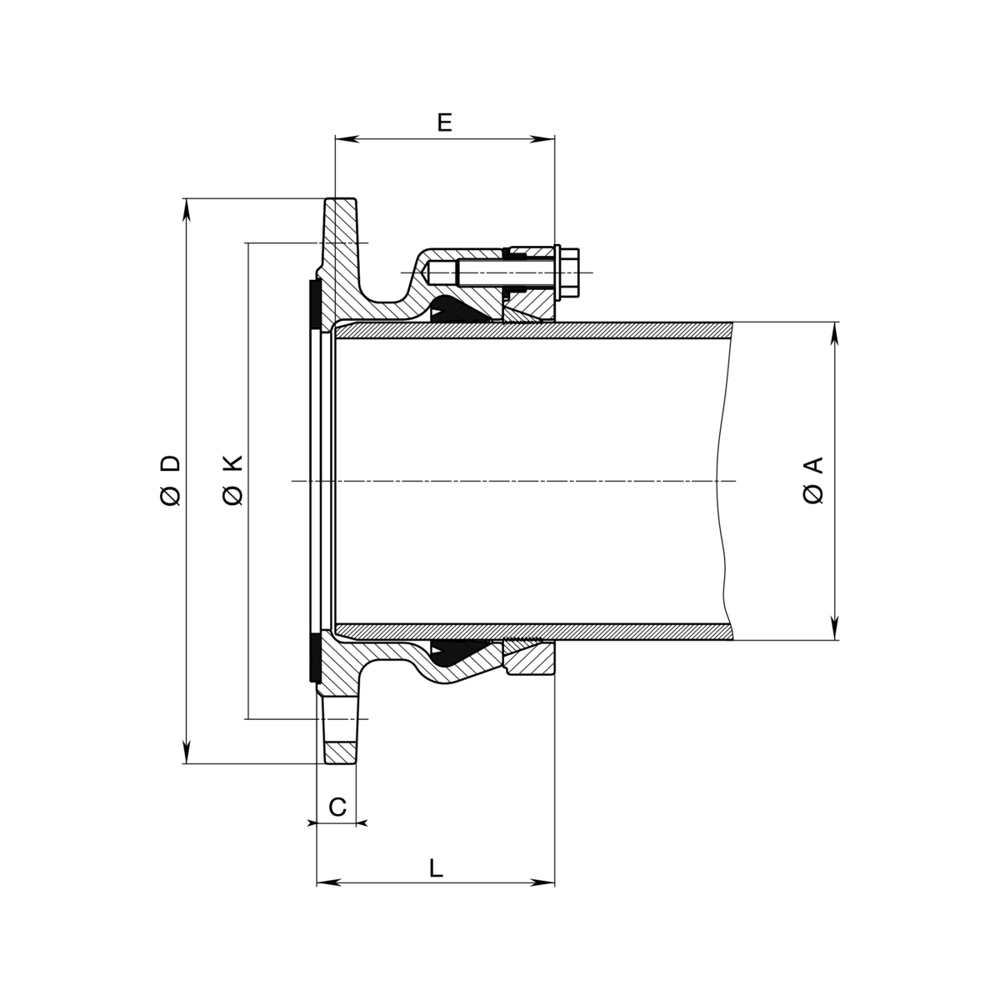 - Zabezpieczenie przed przesunięciem działa niezależnie od uszczelnienia rury i zyskuje się za pomocą pierścienia dociskowego
